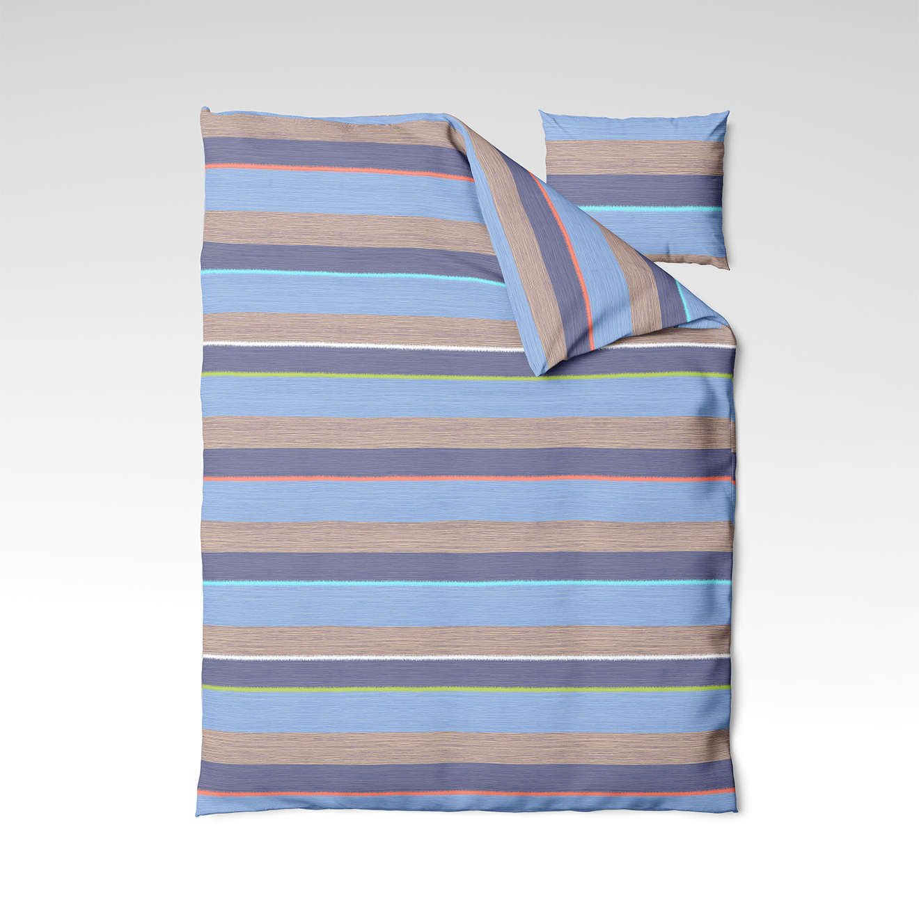 🌊 Coastal Vibes – an energizing and refreshing design inspired by the mood of the seaside. Sky blues, sandy, coral, and green horizontal stripes evoke a sunny summer day by the shore. This design brings colors, vitality, and a sense of freedom to every bedroom.