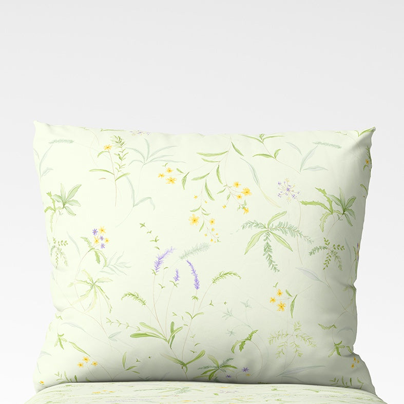 🌿 Meadow Whisper – ett lätt örngott med ängsväxtmotiv. Mjuka pastellfärger och en naturlig sammansättning ger lugn, perfekt för ett ljust och mysigt sovrum.