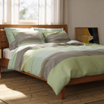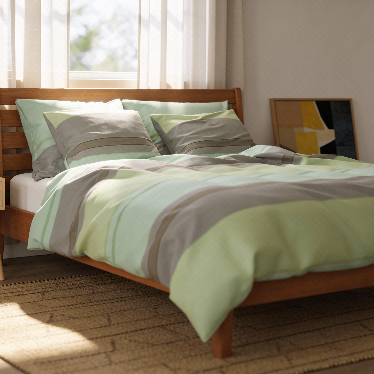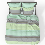 Den lugnande kombinationen av grönt och grått med minimalistiska ränder skapar en mysig och harmonisk inredning. Denna design passar perfekt för dig som gillar naturliga färger och en modern stil.