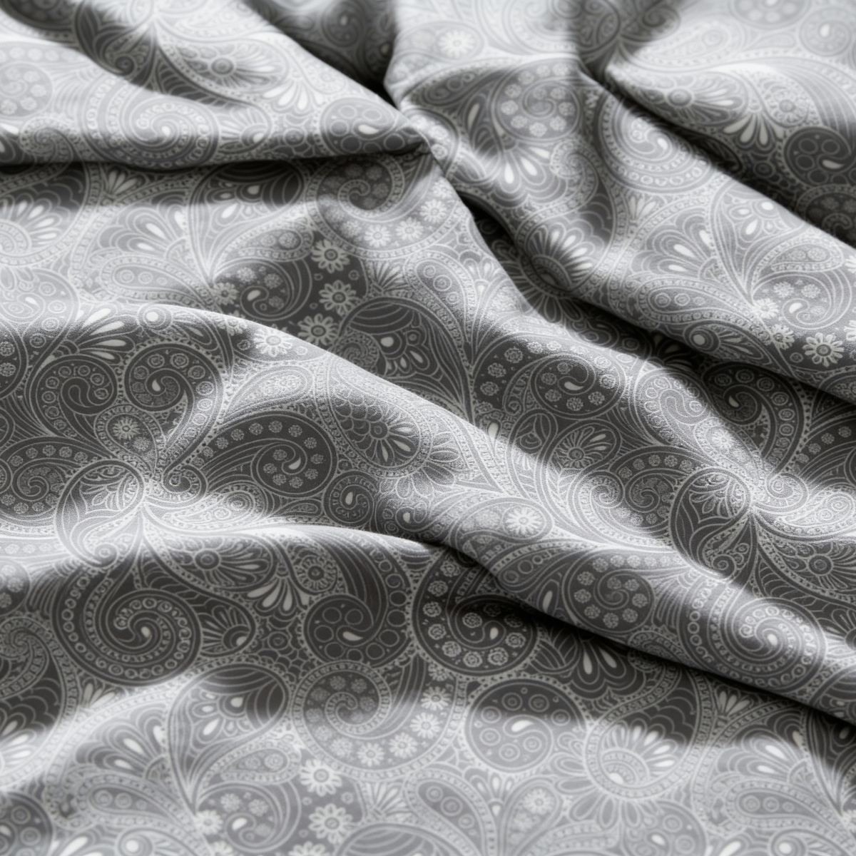 Detta Deluxe satinbomull påslakanset, inspirerat av staden Jaipur, kännetecknas av eleganta och unika paisleymönster som ger inredningen en exklusiv charm. Kombinationen av grått och vitt skapar lugn och harmoni i ditt sovrum så att du kan sjunka ner i en djup och bekväm sömn.