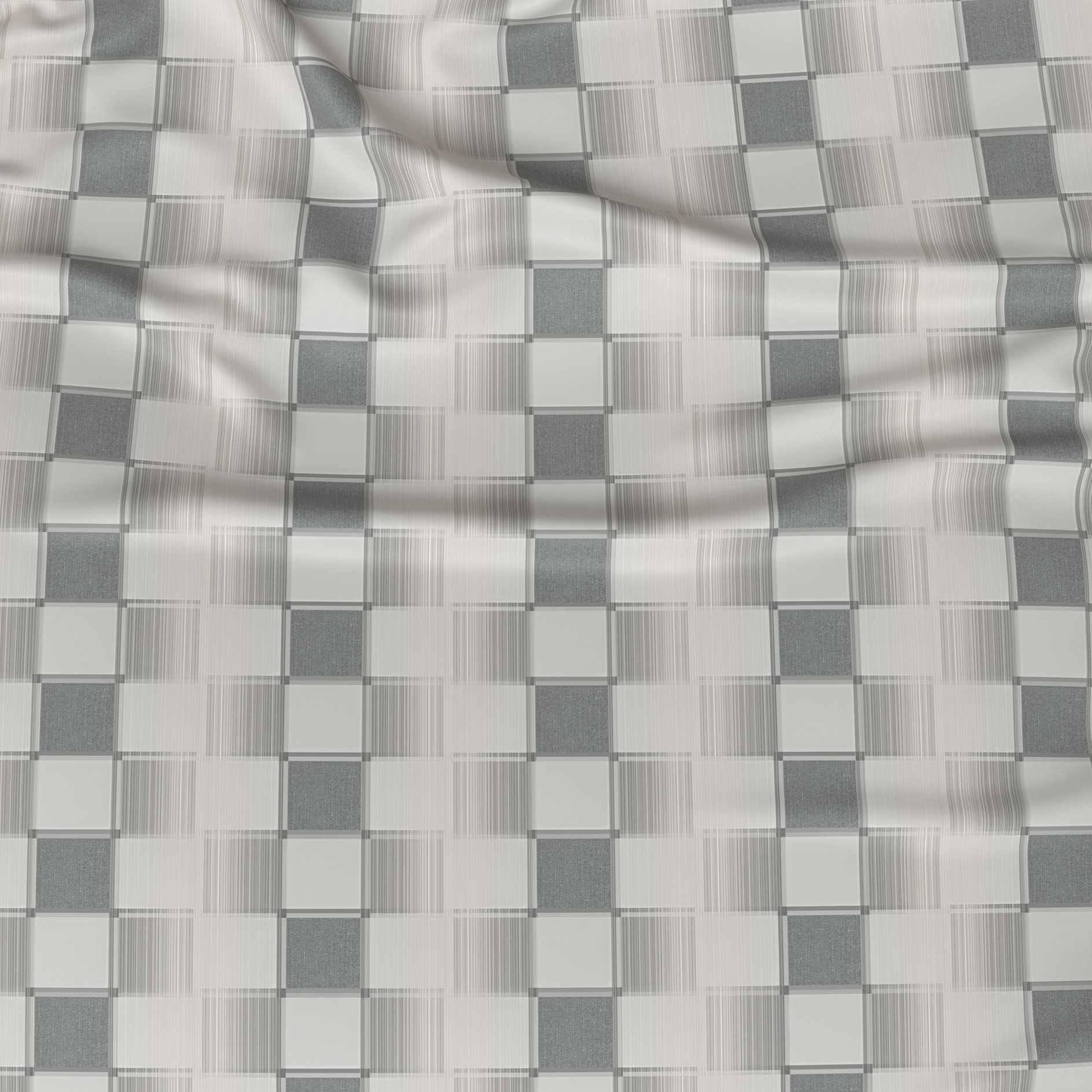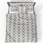 Minimalistisk schackbrädesinspirerad design i sand- och gråa nyanser som kompletterar ett modernt eller industriellt sovrum perfekt.